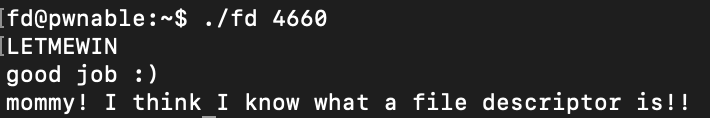 그럼 이제 ./fd 4660을 입력해보자. 그리고 LETMEWIN을 입력해보자.