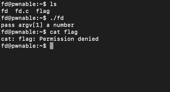 fd파일을 실행하니 pass argv[1] a number이라는 문구가 떴고, flag파일을 cat으로 열어보니 Permission denied 오류가 떴다.