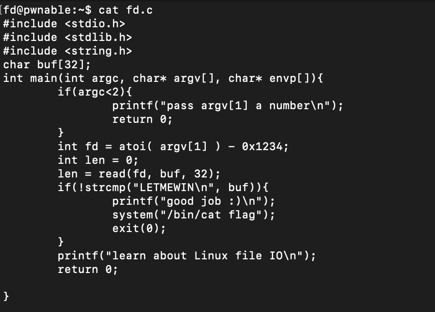 마지막으로 fd.c를 cat으로 열어보니 다음과 같은 c코드가 있었다.