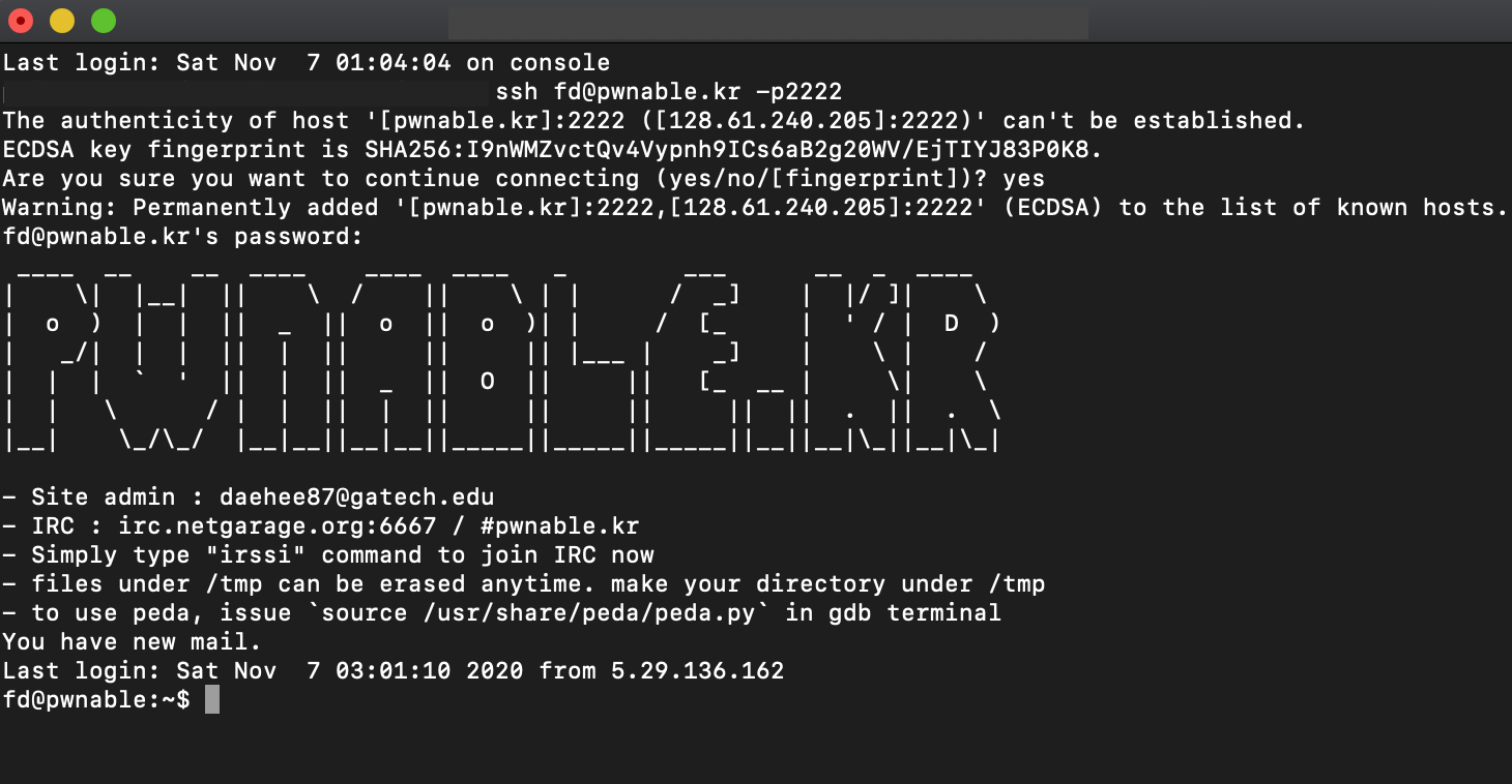 이 문제를 요약하자면 fd@pwnable.kr -p2222에 ssh로 접속해서 fd.c를 분석하여서 fd에 정확한 값을 넣으면 flag값이 나오는 방식이다.