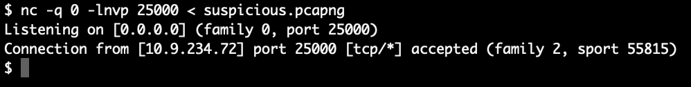nc -q 0 -lnvp 25000 < suspicious.pcapng