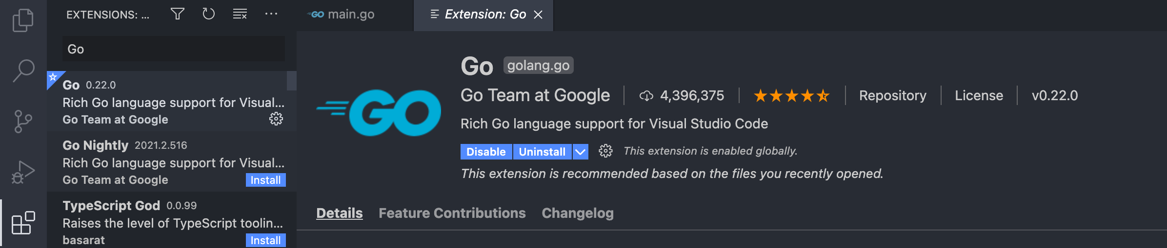 왼쪽에 5개 박스중 5번째를 선택해서 Go를 검색하고 Install 한다.