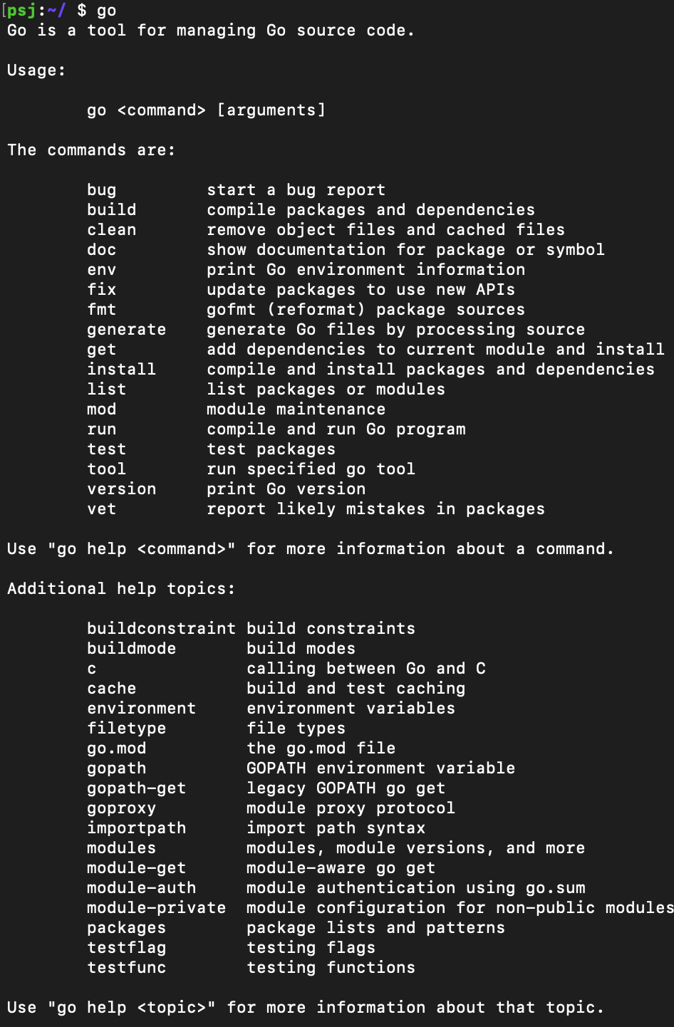설치 후 cmd 또는 terminal에서 "go" 라고 쳤을 때 밑에 처럼 나오는지 확인한다.