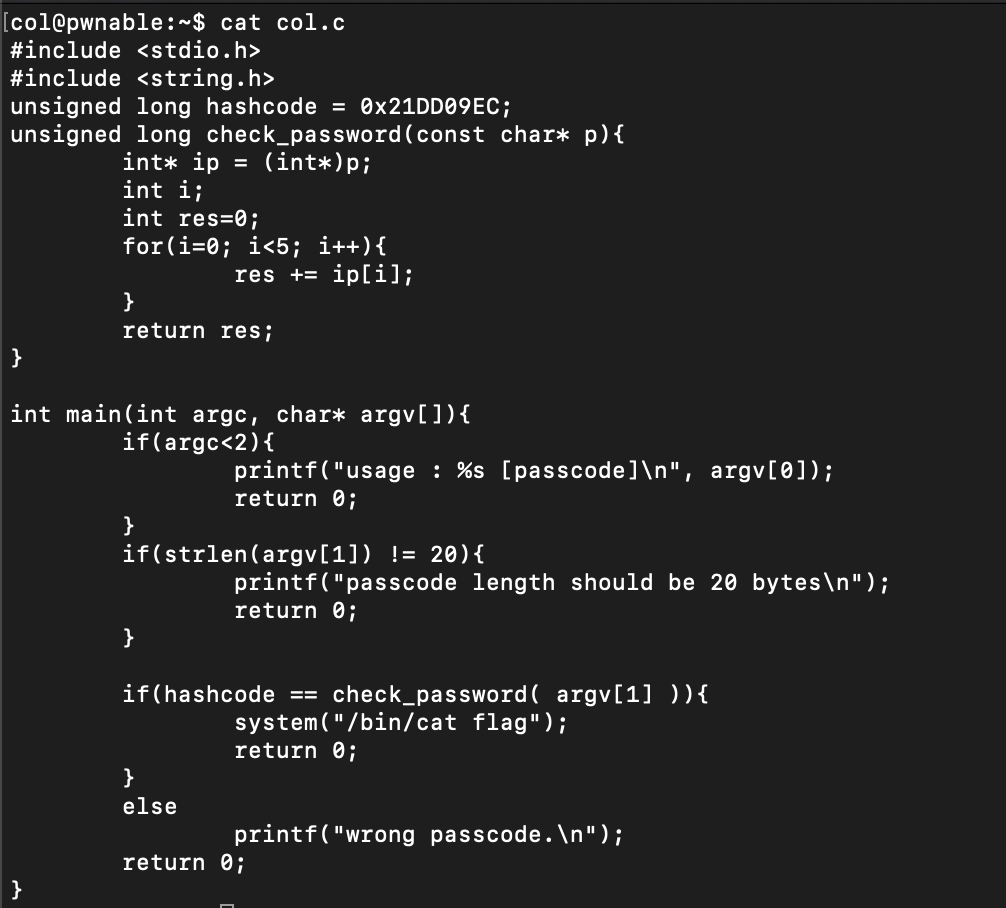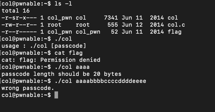 ls -l로 무슨 파일이 있는지 확인했다. 여기는 col, col.c, flag파일이 있다.
