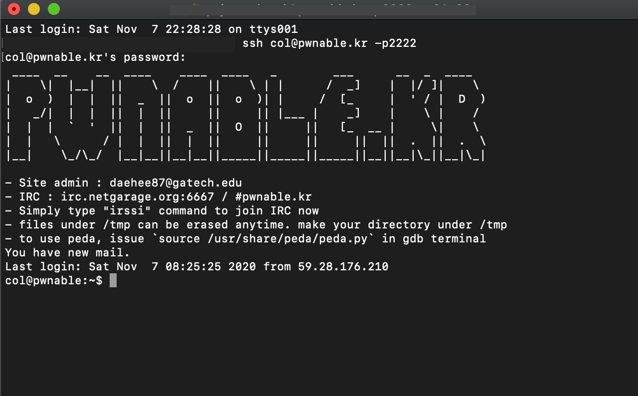 먼저 ssh로 col@pwnable.kr -p2222에 접속을 해보자.