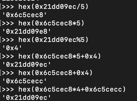 먼저 0x21dd09ec를 5로 나눠 주었더니 0x6c5cec8이라고 나온다.