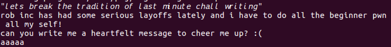 puts("rob inc has had some serious layoffs lately and i have to do all the beginner pwn all my self!");