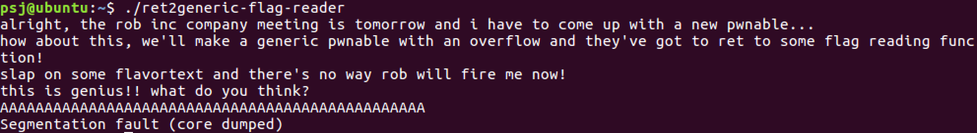 puts("alright, the rob inc company meeting is tomorrow and i have to come up with a new pwnable...");