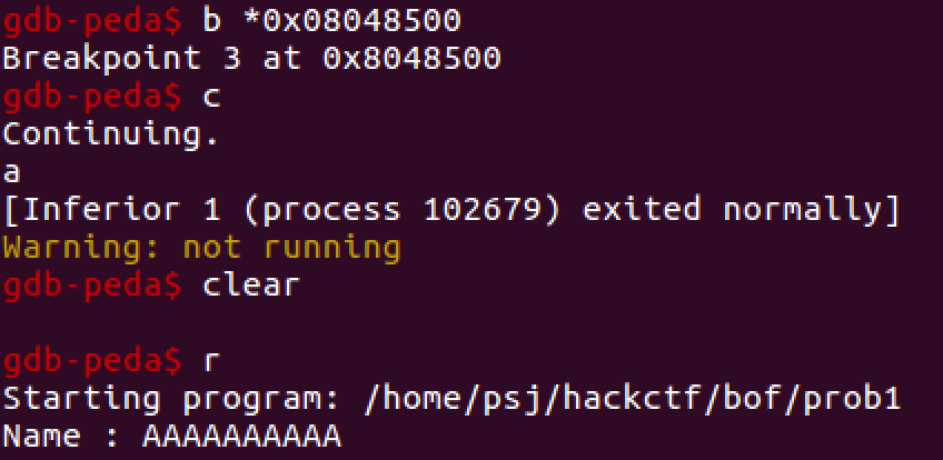 일단 read함수가 실행되고 바로 뒤에 실행되는 부분에 브레이크를 걸고 A를 10개만 넣어보자.