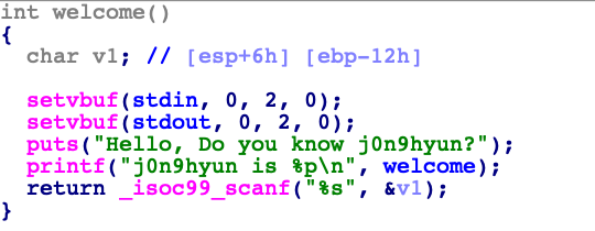그런데 j0n9hyun의 함수가 아니라 welcome의 함수 주소를 출력하는 것이다.