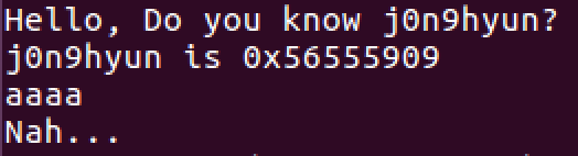 위처럼 j0n9hyun 함수의 주소를 출력하는 것 같고 입력을 받는다.
