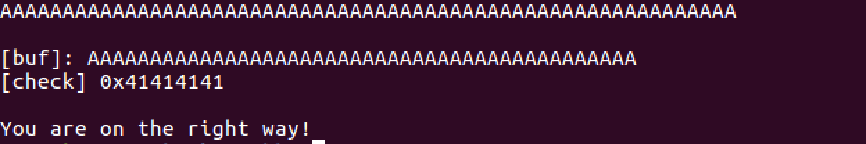 그런데 A를 위보다 더 많이 넣었더니 check가 0x41414141(A는 hex로 41)로 바뀌었다.