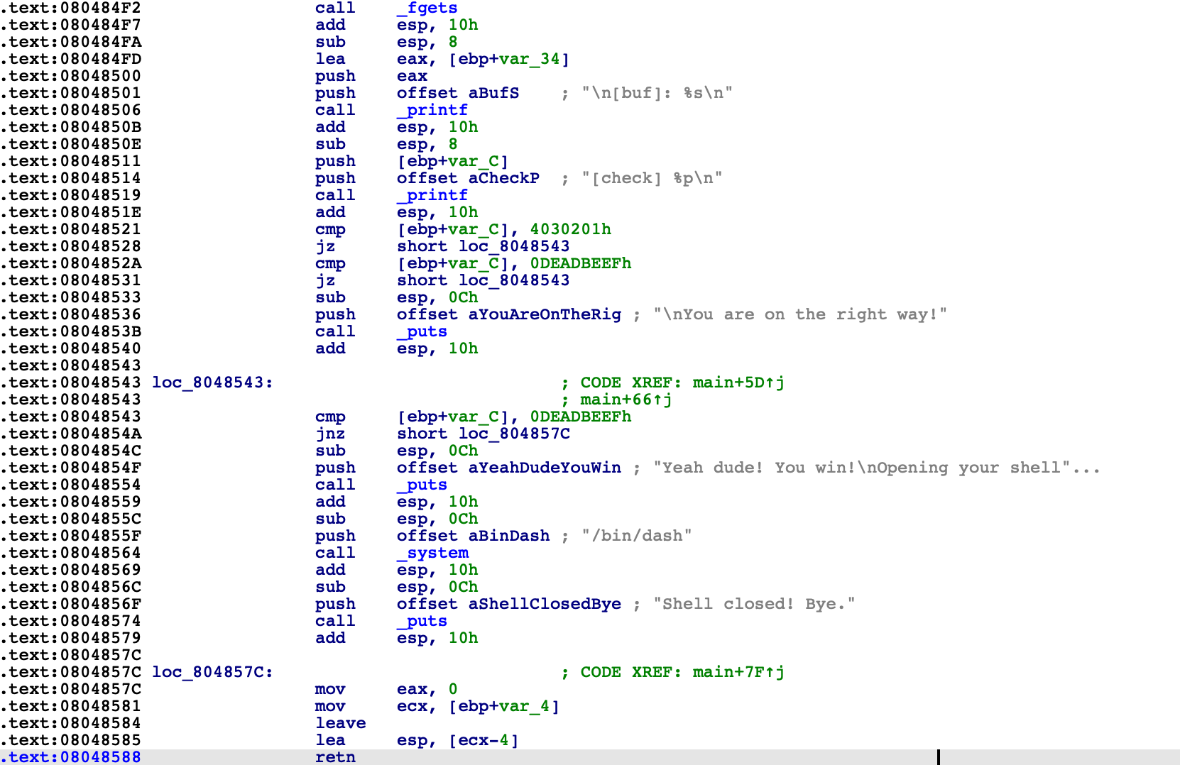 0x08048543 <+120>: cmp DWORD PTR [ebp-0xc],0xdeadbeef