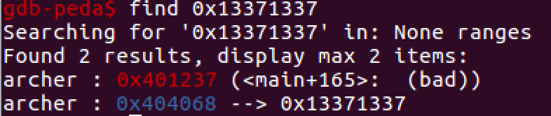 아까 0x13371337이니 find로 찾으면 된다.(이 부분은 gdb peda에서만 가능하다.)