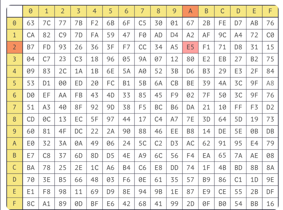 만약 State 중 하나의 바이트가 2A라면 S-box의 2행 A열 즉 E5로 로 치환된다.