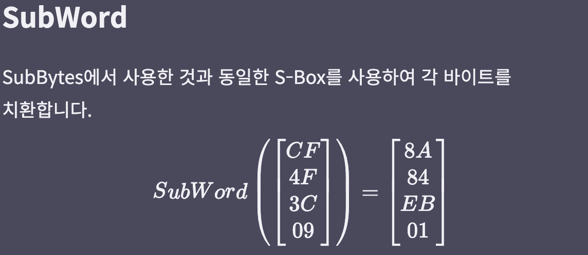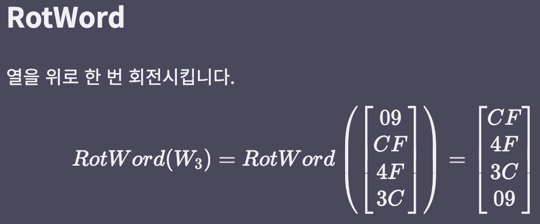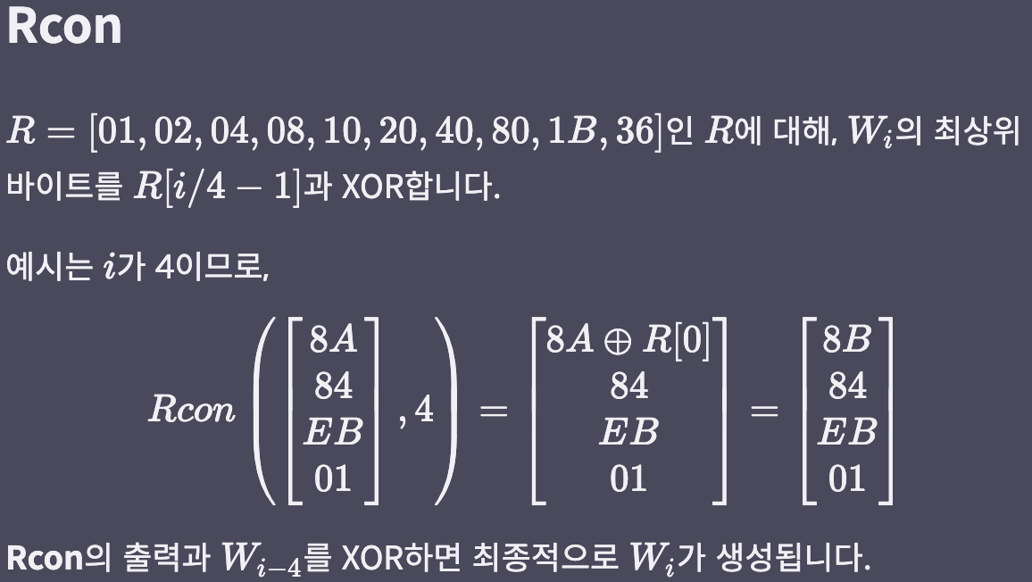 w(i>3)을 w(i-1)에 각각 RotWord, SubWord, Rcon 함수를 적용하고 w(i-4)와 XOR를 하여 생성한다.
