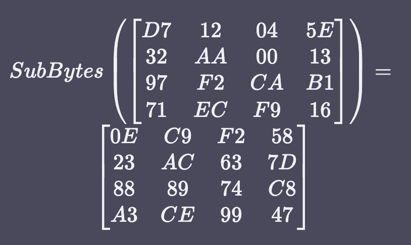 SubBytes는 State의 각 바이트를 S-box를 이용하여 치환하는 함수이다.