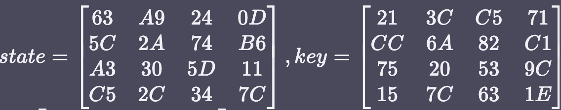AddRoundKey는 state에 생성된 Round key(키생성함수에서 생성한 키)를 XOR하는 함수이다.
