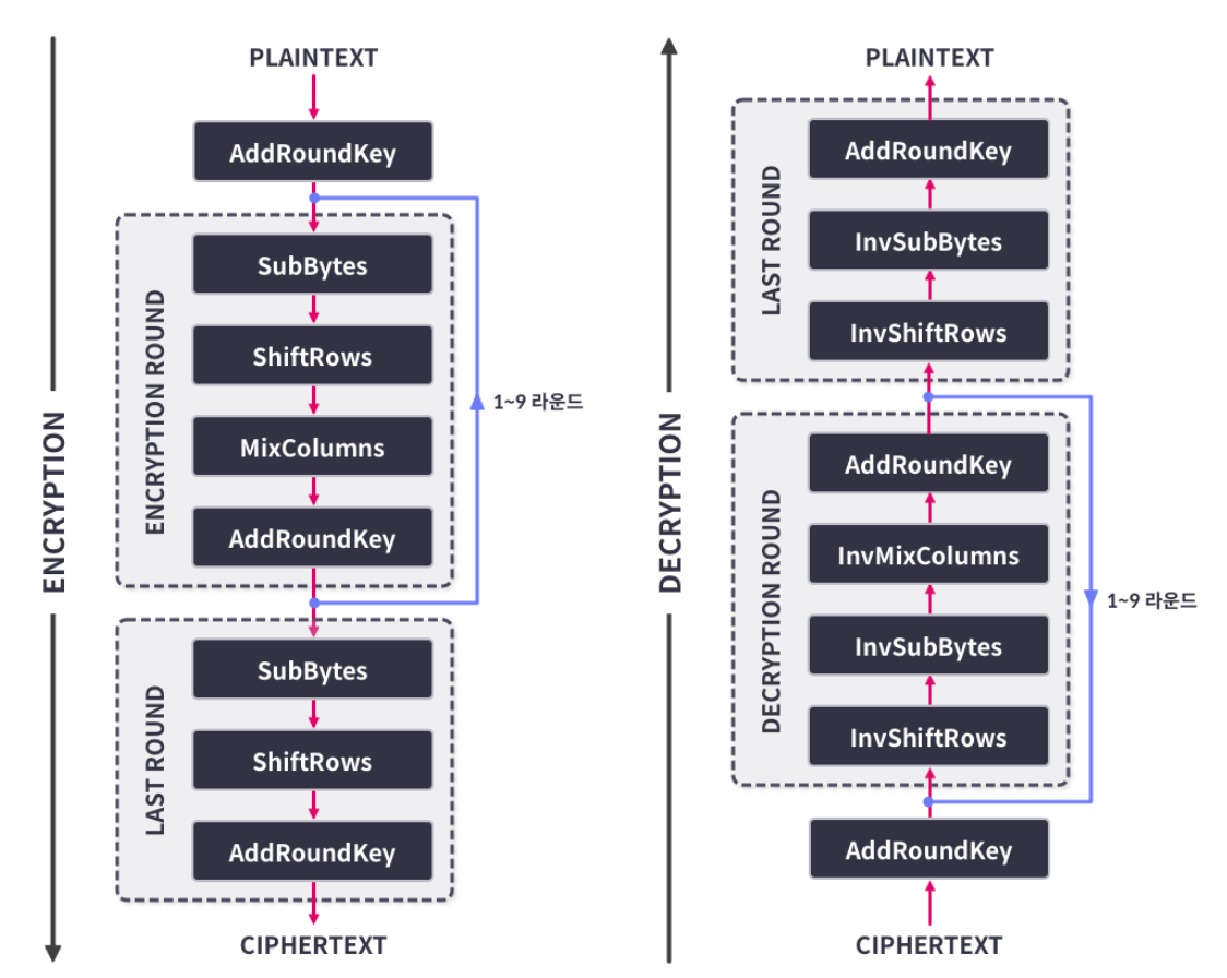 AES는 기본적으로 라운드마다 128비트를 암호화하는 블록 암호이다.