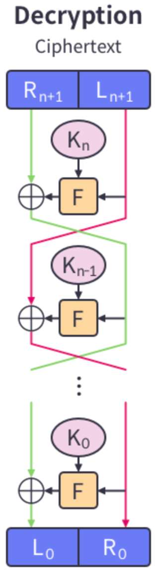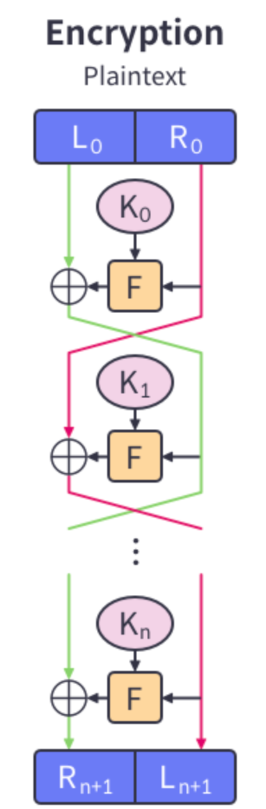 각 라운드마다 L(n+1) = R(n)이 되고, R(n+1)은 라운드 함수 F를 K(n),R(n)에 적용시킨 값과 L(n)을 XOR한 값이 된다.