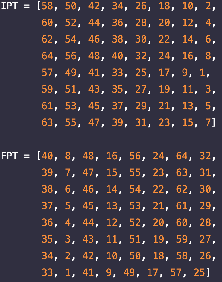 이는 초기순열, 최종순열이라고도 하는데 입력받은 64비트를 정해진 테이블을 이용하여 전치하는 것이다.