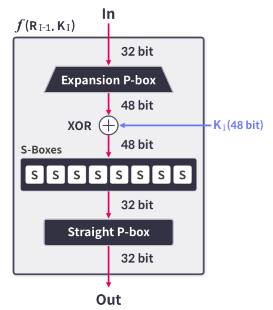 라운드함수는 확장순열, 라운드 키 결합, S-box, 고정순열로 이루어진다.