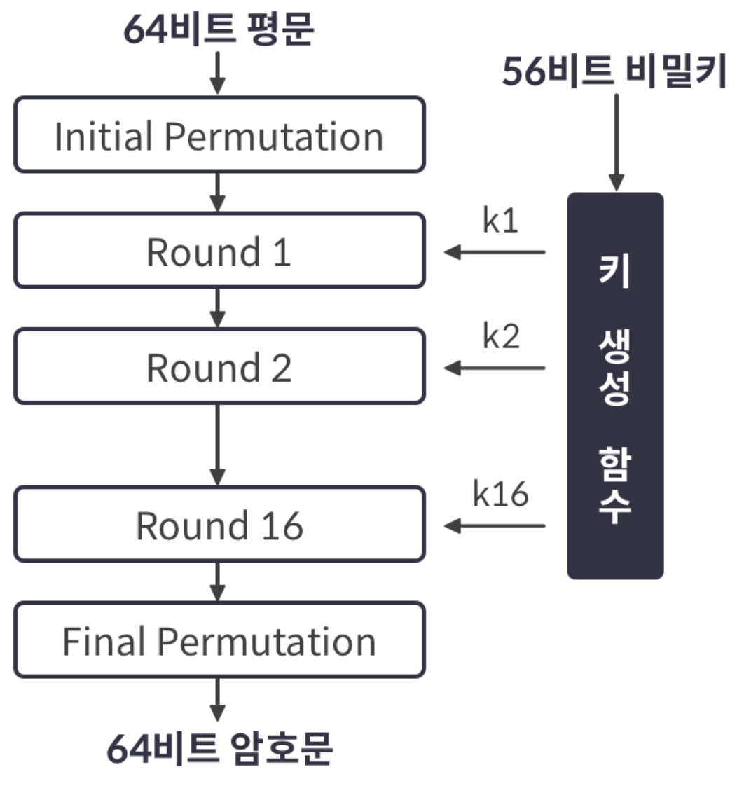 DES는 IP(초기순열), FP(최종순열), Feistel 구조, 각 라운드에 사용되는 48비트의 키를 생성하는 키 생성 함수로 이루어져 있다.