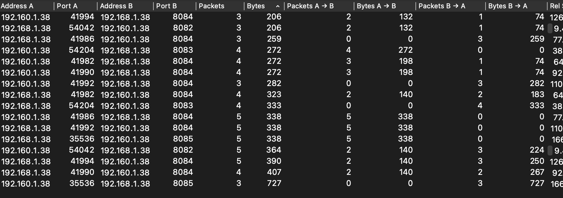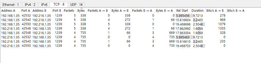 일단 Coversation 탭에서 Tcp부분을 Byte 내림차순으로 나열해보자.