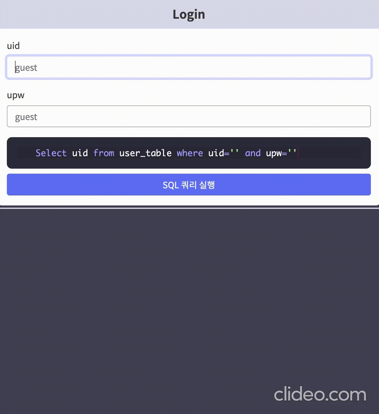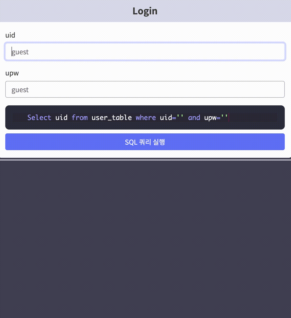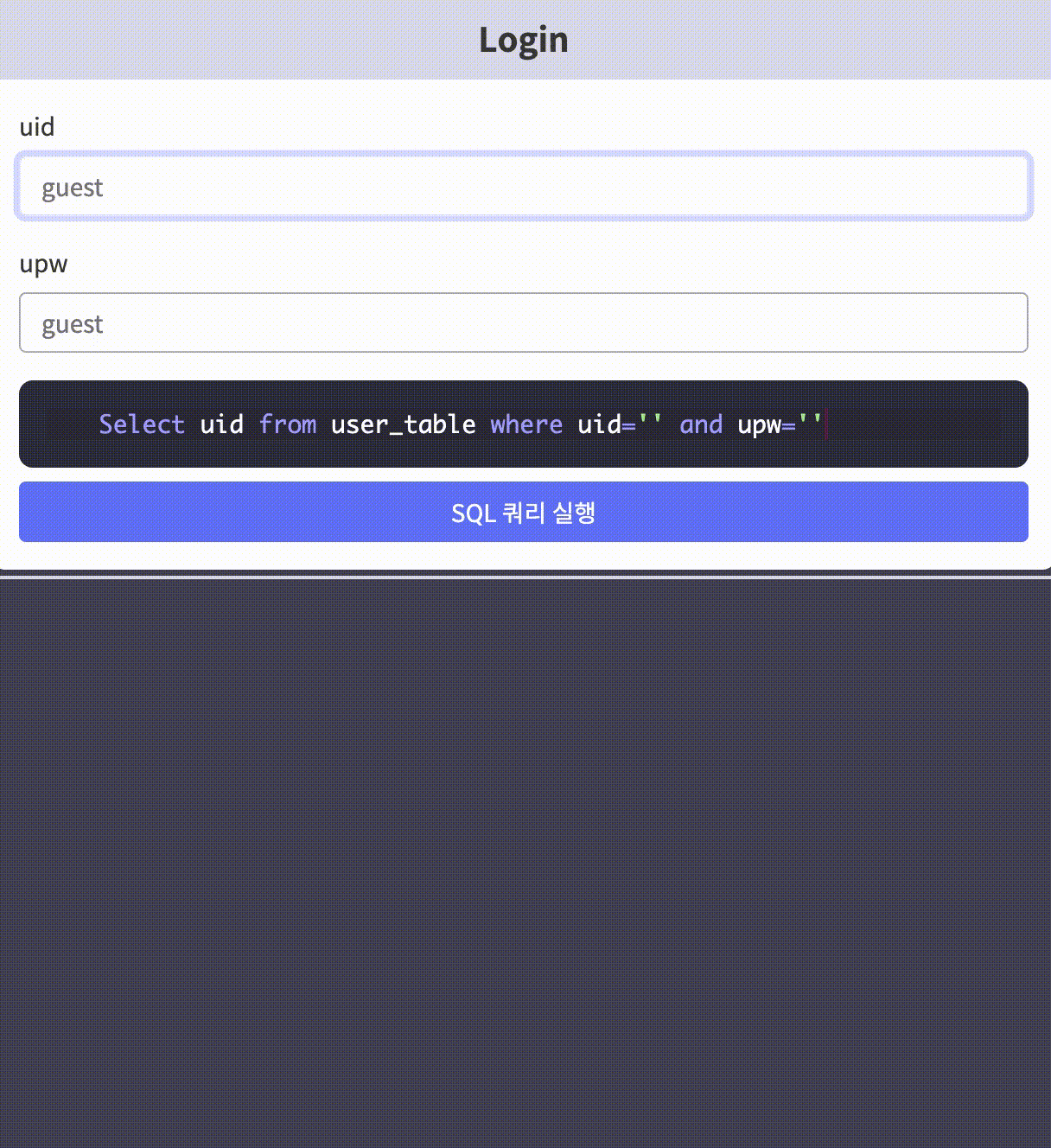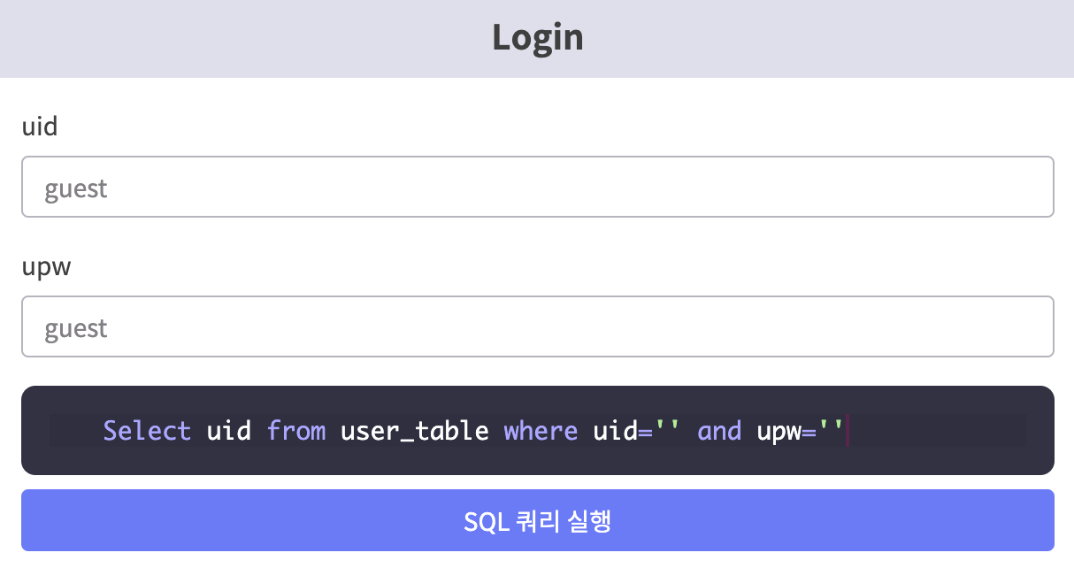 위처럼 로그인을 할 수 있는 폼이 있고, 아래에 SQL 구문이 입력에 따라 어떻게 달라지는지 확인할 수 있다.