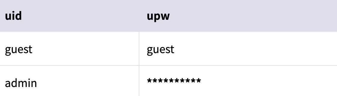 첫 번째 조건은 uid가 “admin”인 데이터, 두 번째 조건은 이전의 식이 참(True)이고, upw가 없는 경우이다.