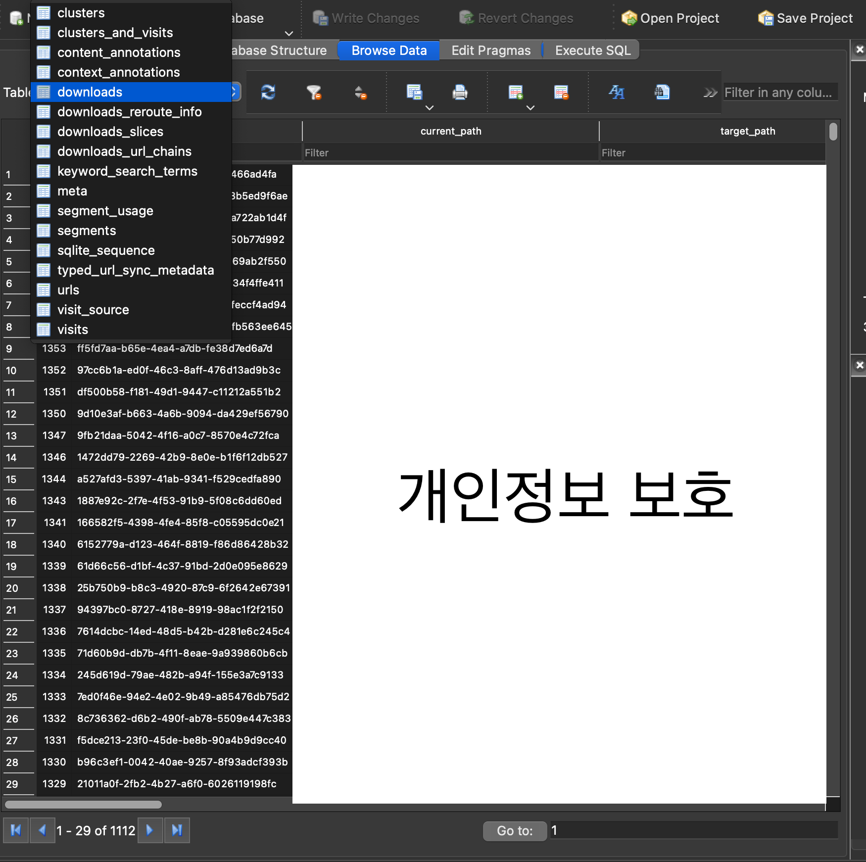 이걸 DB for sqlite3을 이용해서 열면 다음과 같이 나온다.