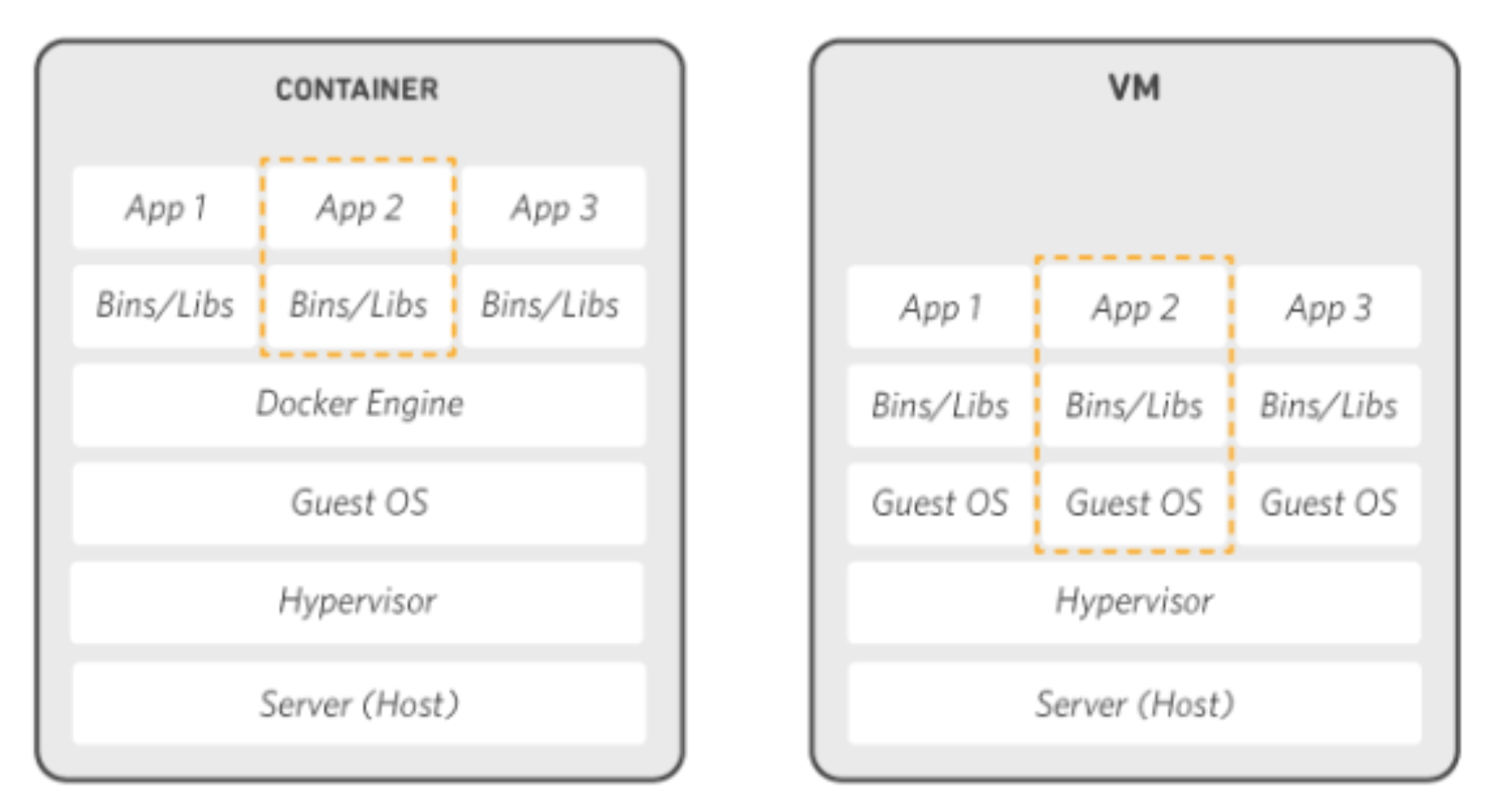 Docker는 container, VM으로 나뉘는데 구조의 차이점은 다음과 같다.(자세히 알아보지 않아도 된다)