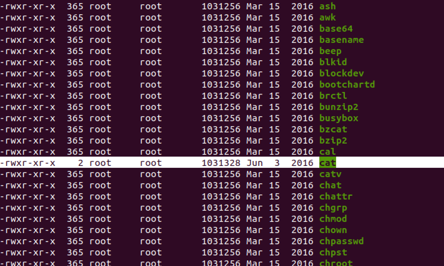 명령어 파일은 "/bin"에 있으니 들어가서 ls -al로 무슨 파일이 비정상적인지 확인해보자.