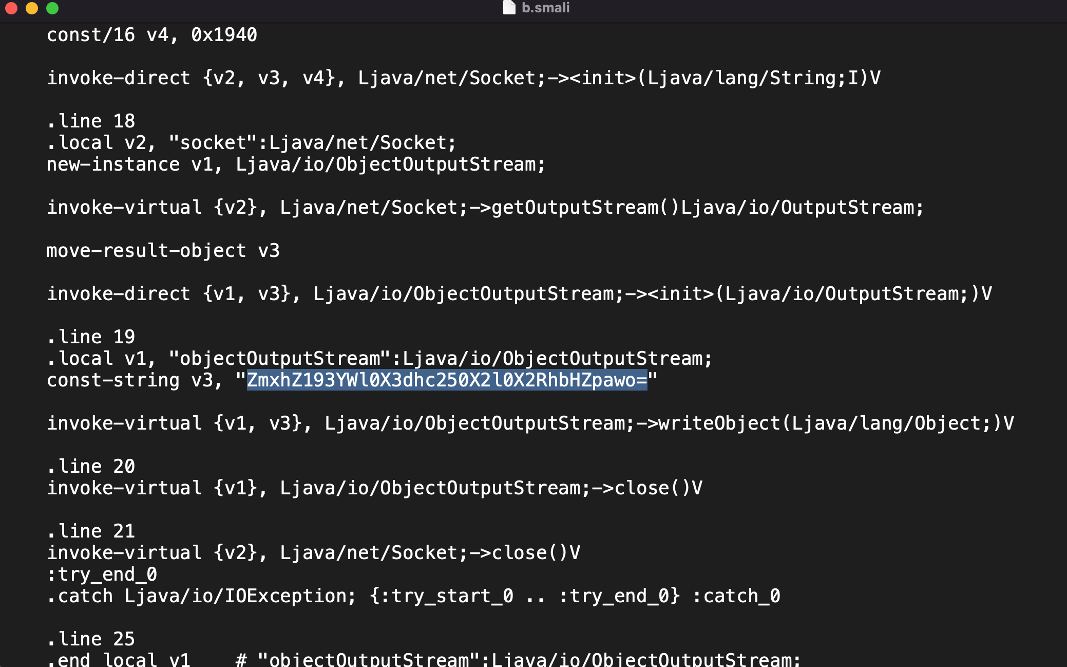 위와 같이 여러 파일들이 있는데 b.smali를 살펴보면 아래와 같이 의미심장한 문자열이 있다.(실제로는 위 파일들을 일일이 확인을 다 해야한다.)