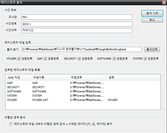 먼저 REGA를 실행하여 레지스트리 분석을 선택하여 아래와 같이 아까 추출한 파일을 담은 폴더를 선택하고 여러 가지 부가 사항을 아무렇게나 적는다.
