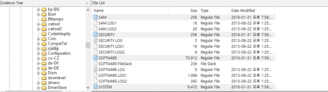 먼저 C:\WIndows\System32\config\ 에서 Default, SAM, SECURITY, SOFTWARE, SYSTEM를 추출한다.