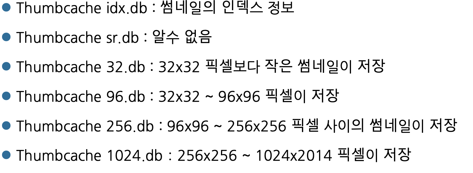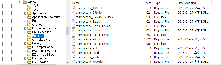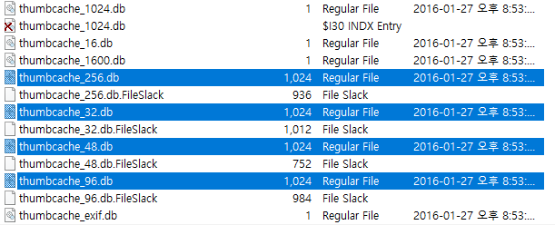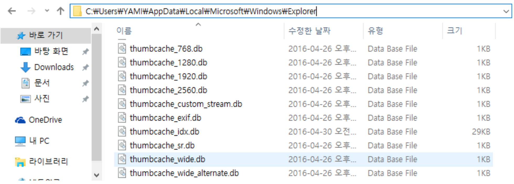 파일들은 각각 thumbcache_*.db로 저장되는 걸 확인할 수 있다.(*는 썸네일의 픽셀 별로 나누기 위한 것이다)
