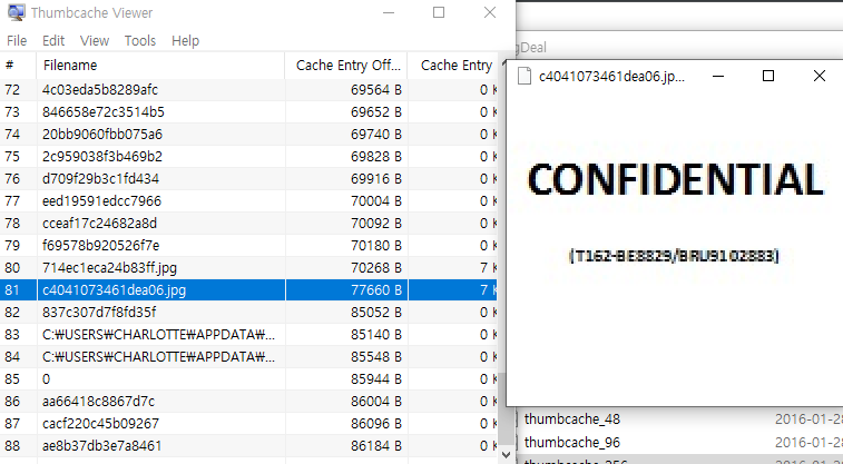추출한 파일로 아까 말한 Thumbnail Viewer로 확인해보면, 아래와 같이 thumbnail_256.db에 다음과 같이 기밀 코드를 확인할 수 있다.