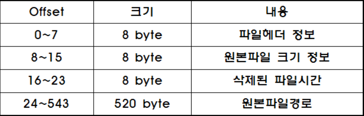그리고 오른쪽에 Recycle.bin안에 있는 파일들을 보면 $I~~~ , $R~~~ 이렇게 두 개의 같은 이름의 파일(~~~ <- 이 부분이 같음)이 있다. 사실 $R은 실제 파일의 데이터이고, $I는 $R의 메타데이터를 담고 있다.(파일 경로, 삭제 시간, 사이즈 등등)