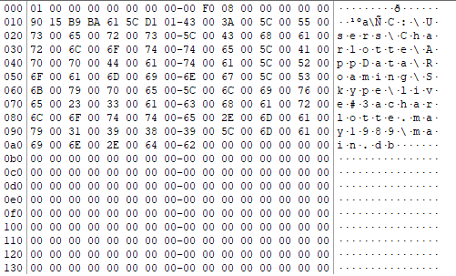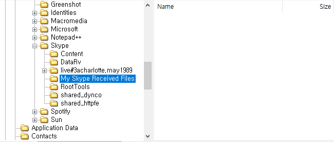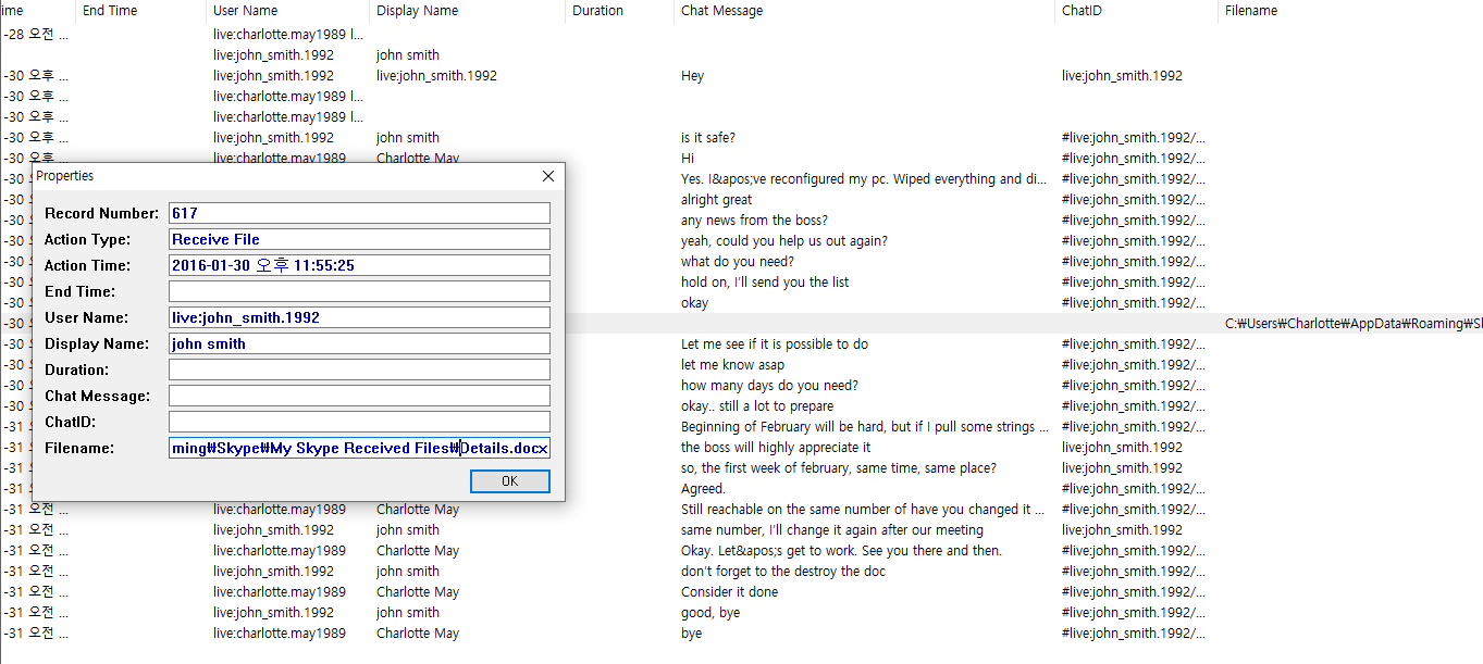 파일 경로는 C:\Users\Charlotte\AppData\Roaming\Skype\live#3acharlottemayl989\main.db 이다.