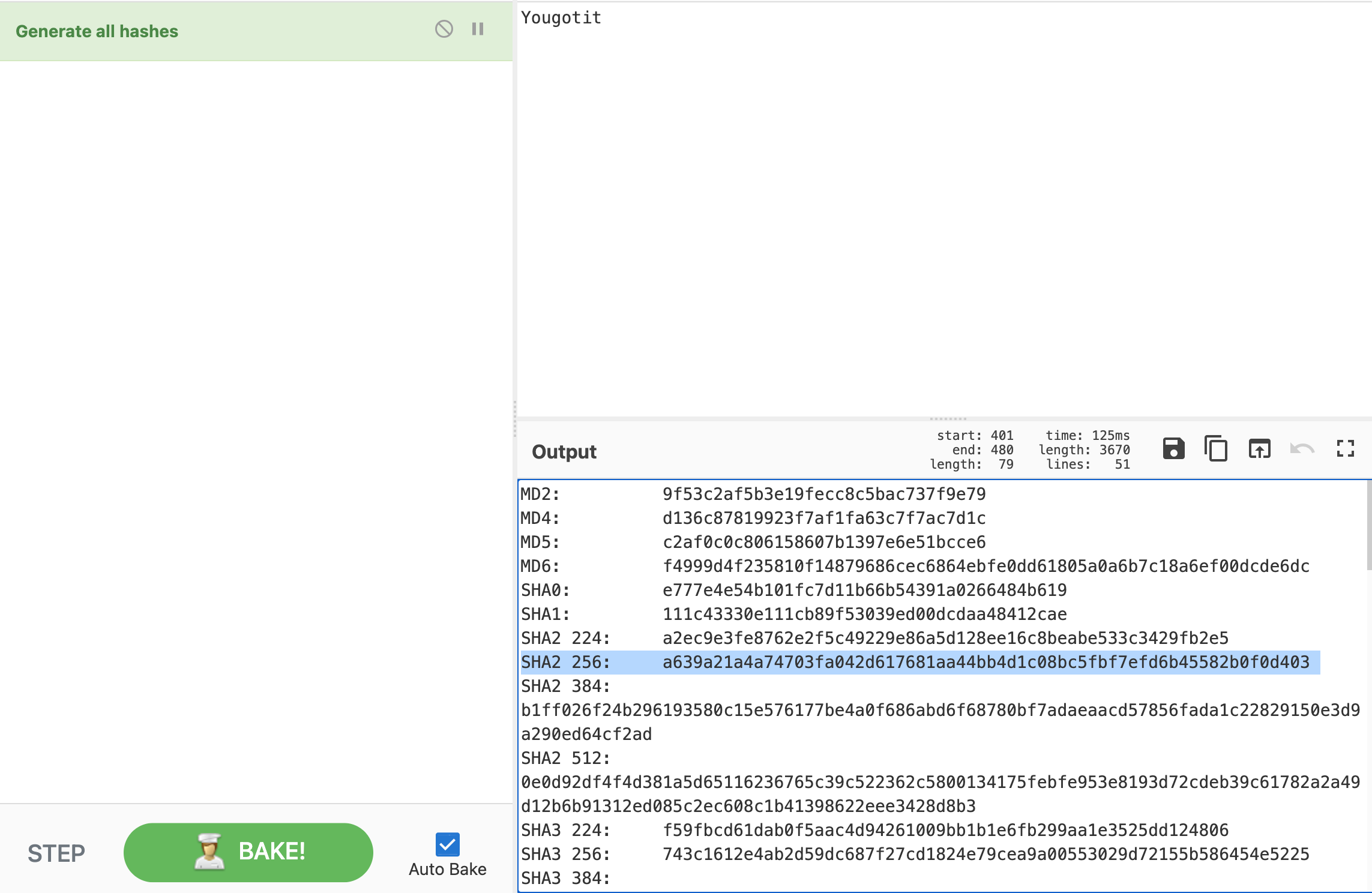 Yougotit 문자열을 sha256하면 아래와 같이 아까 우리 찾았던 문자열이 나오는 것을 확인할 수 있다.