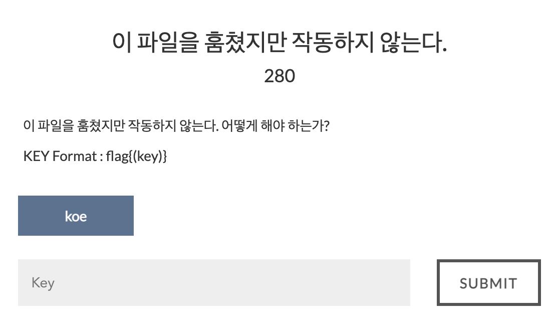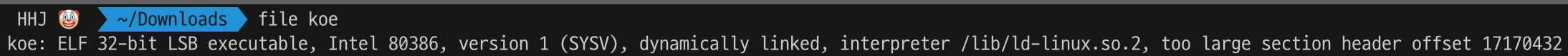 먼저 주어진 파일은 koe라는 파일인데, 다음과 같이 바이너리 파일인 것을 확인할 수 있다.