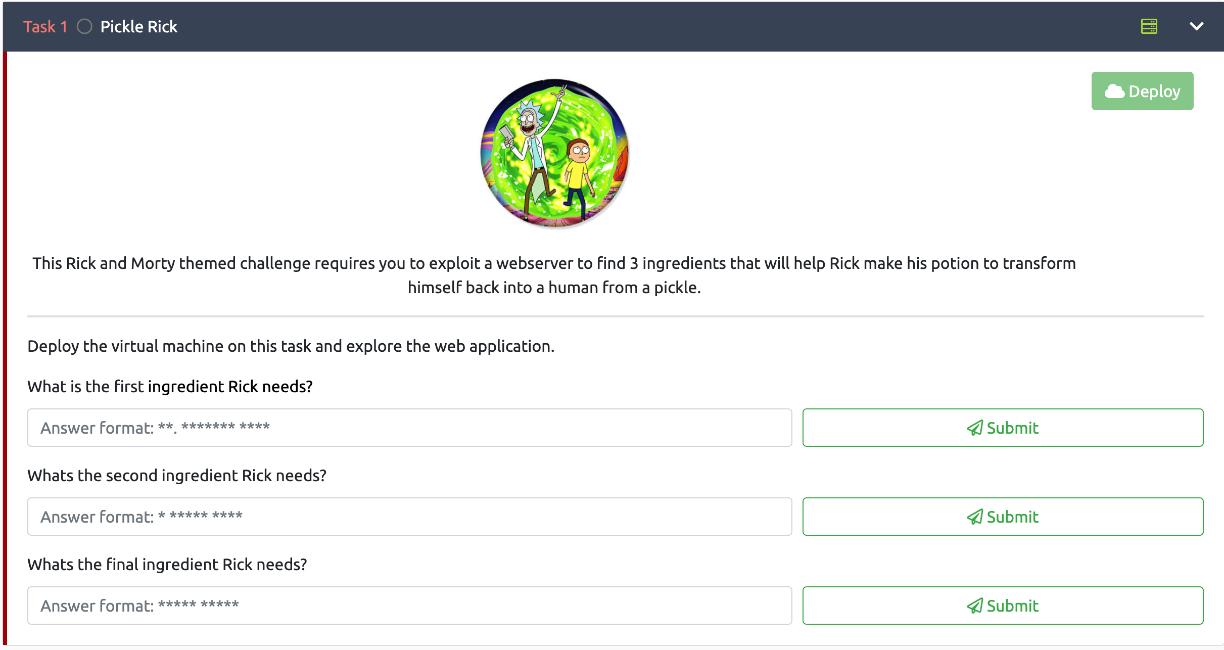 이 PickleRick 룸은 릭이 피클에서 다시 사람으로 변신하기 위해 필요한 재료를 문제에서 준 ip 주소를 분석하여 제출 해야하는 문제이다.