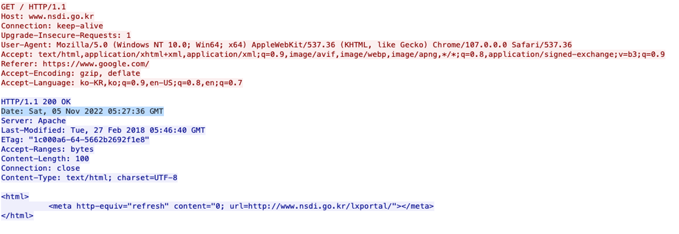 이 중 제일 처음으로 통신된 피켓의 http stream을 확인하면 www.nsdi.go.kr로 통신된 걸 확인할 수 있다.