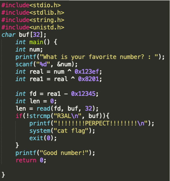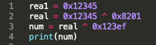 일단 read는 fd가 0이면 정상처리가 된다. 따라서 rea1은 0x12345로 시작하고 real이 num과 0x123ef와 xor된 값, real1이 real과 0x8201과 xor 해서 0x12345가 되어야 한다. 따라서 xor 역연산으로 num을 구할 수 있다.