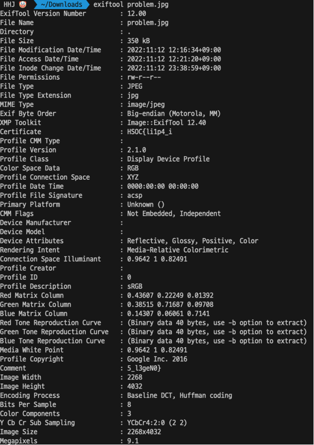 그래서 문제 분석 겸 exiftool로 확인해봤는데 다음과 같이 certificate와 comment 항목에 플래그가 있는 걸 확인할 수 있다.
