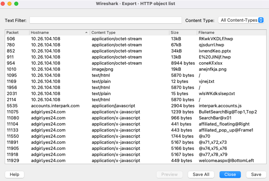 먼저 파일을 wireshark로 열어서 object 탭을 확인해보면 다음과 같다.