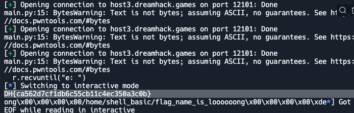 3. sendline으로 shellcode를 전송한뒤 interactive를 한다.
